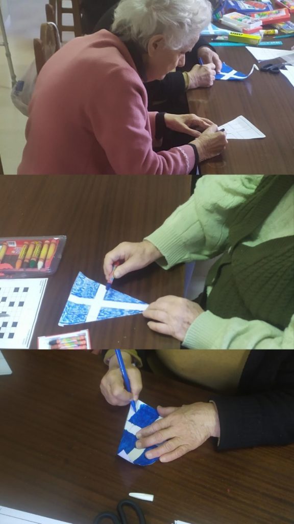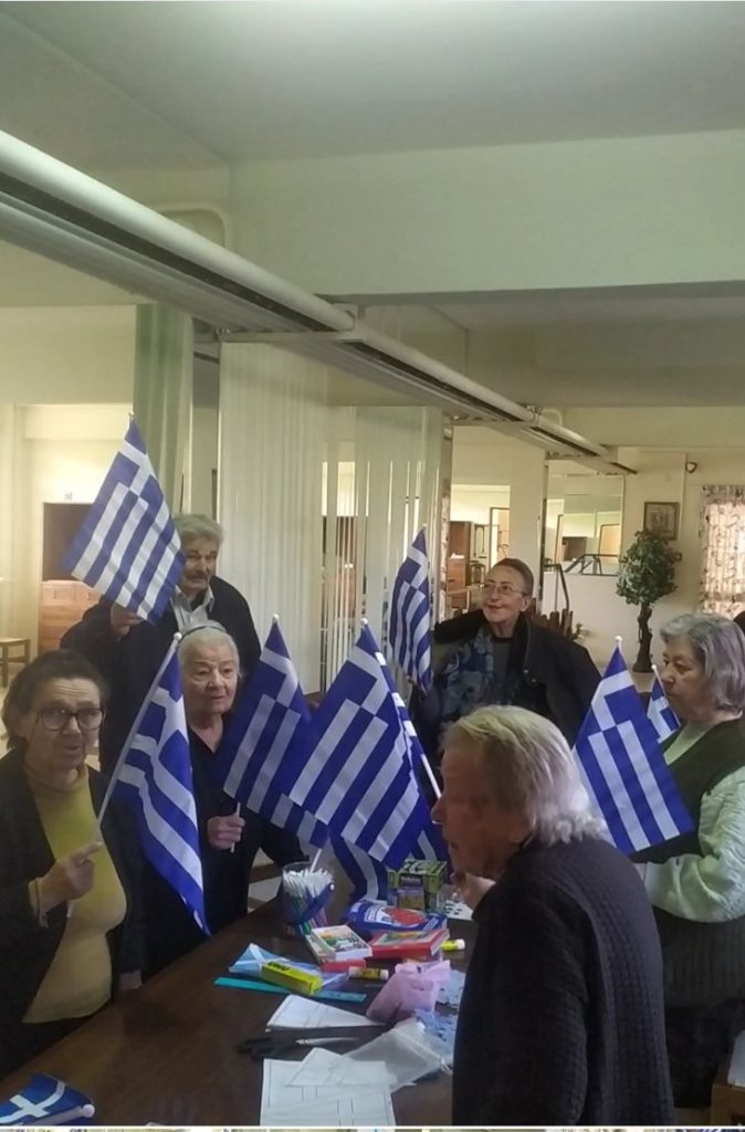 Εν όψει του εορτασμού, οι τρόφιμοι κατασκεύασαν σημαίες στα πλαίσια του εργαστηρίου δημιουργικής απασχόλησης με τις οποίες στολίστηκε ο χώρος του Γηροκομείου.