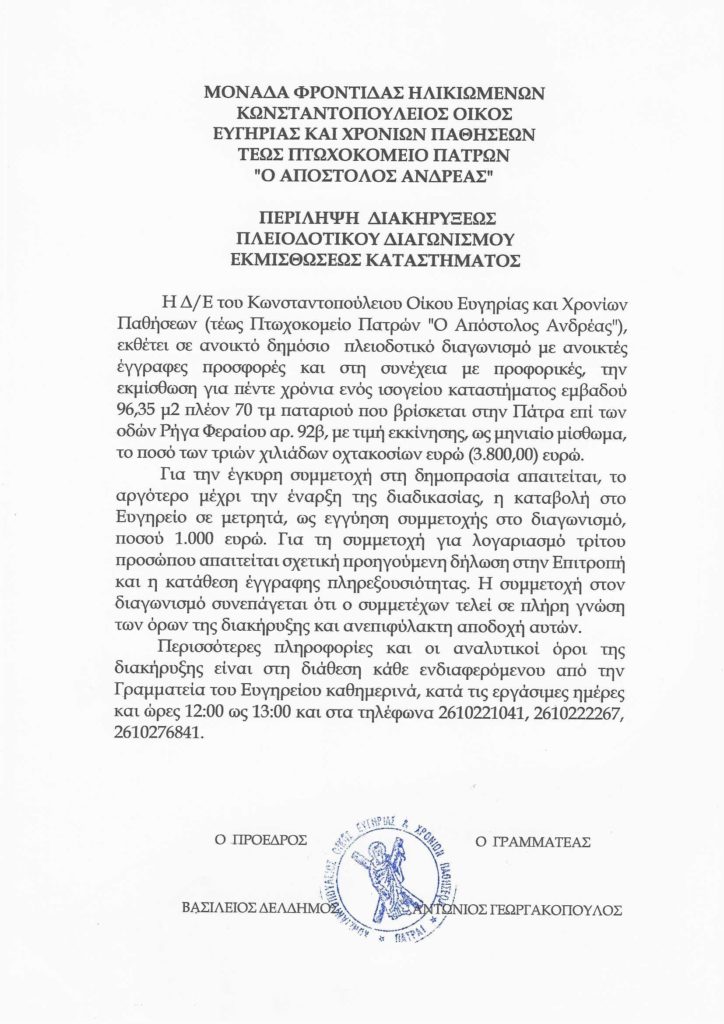 ΠΕΡΙΛΗΨΗ ΔΙΑΚΗΡΥΞΕΩΣ ΕΚΜΙΣΘΩΣΕΩΣ ΚΑΤΑΣΤΗΜΑΤΟΣ Post author:Κωνσταντοπούλειο Ευγηρείο Post published:April 25, 2023 Post category:UncategorizedΠαρακαλώ διαβάστε το κάτωθι έγγραφο:Δημοσιεύστε στο FacebookΑκολουθήστε μας You Might Also Like ΟΡΚΩΤΟΙ ΣΤΟ ΚΩΝΣΤΑΝΤΟΠΟΥΛΕΙΟ ΑΠΟ ΤΗ ΝΕΑ ΔΙΟΙΚΗΣΗ August 5, 2020 Εορτασμός της Εθνικής Επετείου της 25ης Μαρτίου March 25, 2021 Παγκόσμια Ημέρα της Γυναίκας March 16, 2021